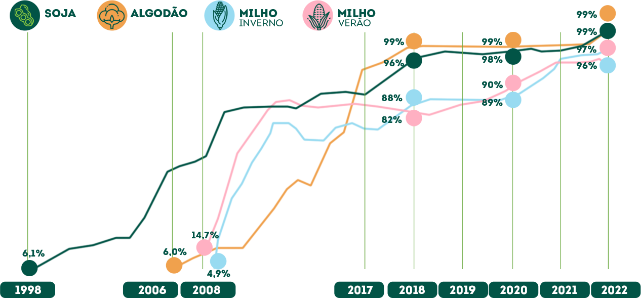 Os benefícios das tecnologias incluídas nas sementes aprimoradas pela biotecnologia ficam evidentes pelas elevadas taxas de adoção no campo (safra 2022/23):