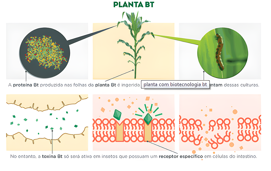 Quando um ou mais genes Bt são inseridos em uma planta, ela passa a produzir essa proteína Cry. Assim, quando as larvas de insetos se alimentam das folhas dessa planta, ingerem a toxina. No entanto, nem todos os insetos irão morrer, isso porque cada proteína Cry é específica para um grupo de insetos.