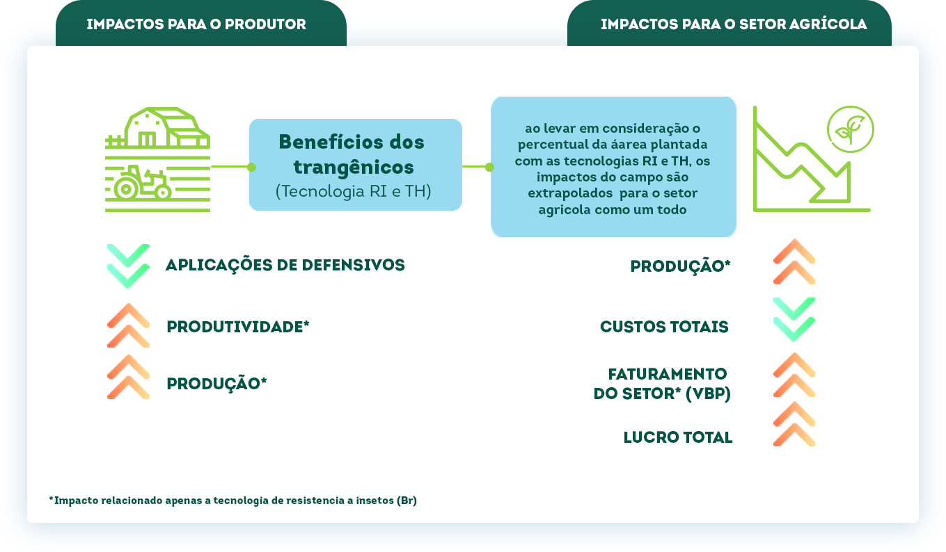 Os impactos ambientais também são relevantes. Por meio da biotecnologia, as sementes se tornaram mais resistentes a pragas e doenças, com isso houve uma redução na dosagem aplicada de defensivos (incluindo adjuvantes relacionados) de 35,0% para soja, de 16,2% para milho verão, de 16,4% para milho inverno e de 27,5% para algodão.