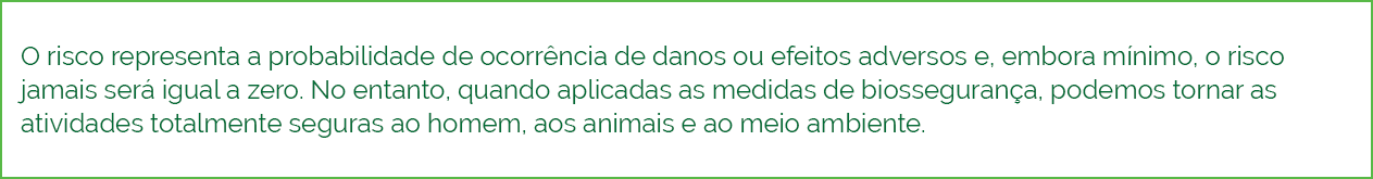 Considerando que o risco é inerente à qualquer atividade, é fácil prever que os riscos relacionados à biossegurança podem aparecer em diversos momentos, por exemplo, em atividades de produção, ensino, desenvolvimento tecnológico ou prestação de serviços.