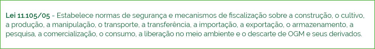 Em 24 de março de 2005, o então presidente da República, Luiz Inácio Lula da Silva, aprovou a lei nº 11.105 (Lei de Biossegurança) que regulamentou todos os aspectos do uso de organismos geneticamente modificados (OGM) no Brasil, incluindo pesquisa em contenção, experimentação em campo, transporte, importação, produção, armazenamento e comercialização.