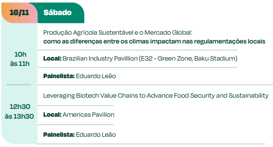 “Além do acesso a recursos adequados, o alcance de uma produção agrícola sustentável e resiliente dependerá de cooperação internacional, estímulo à inovação e ampliação do acesso a tecnologias. Esses fatores são essenciais para garantir a oferta de alimentos com qualidade e em quantidade suficiente, diante do crescimento da população global”, pontuou o presidente da CropLife Brasil, Eduardo Leão, que estará em Baku acompanhado da gerente de Comunicação e Clima da CLB, Renata Meliga.