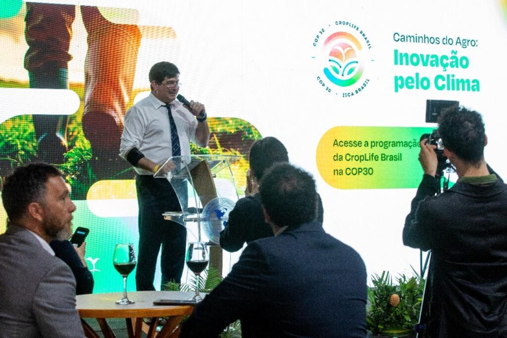 “Nós estamos nesta jornada deste o início do ano, junto ao IICA, visando trabalhar sobre um documento que possa realçar o papel das tecnologias para a redução do aquecimento global e para o enfrentamento da insegurança alimentar. Esse é o nosso objetivo na COP30. Preparamos esse documento, a várias mãos, para que possamos levar para a discussão dados técnicos e fundamentação científica do que estamos vivendo. Nós temos uma agricultura tropical, que é um exemplo e uma referência para a agricultura do mundo, e cada vez mais temos caminhado para práticas mais sustentáveis, como: plantio direto, integração lavoura-pecuária-floresta, práticas de manejo, complementariedade de tecnologias, que tornam nossa agricultura mais produtiva e resiliente”, considerou o diretor-presidente da CropLife Brasil, Eduardo Leão, em seu discurso oficial.