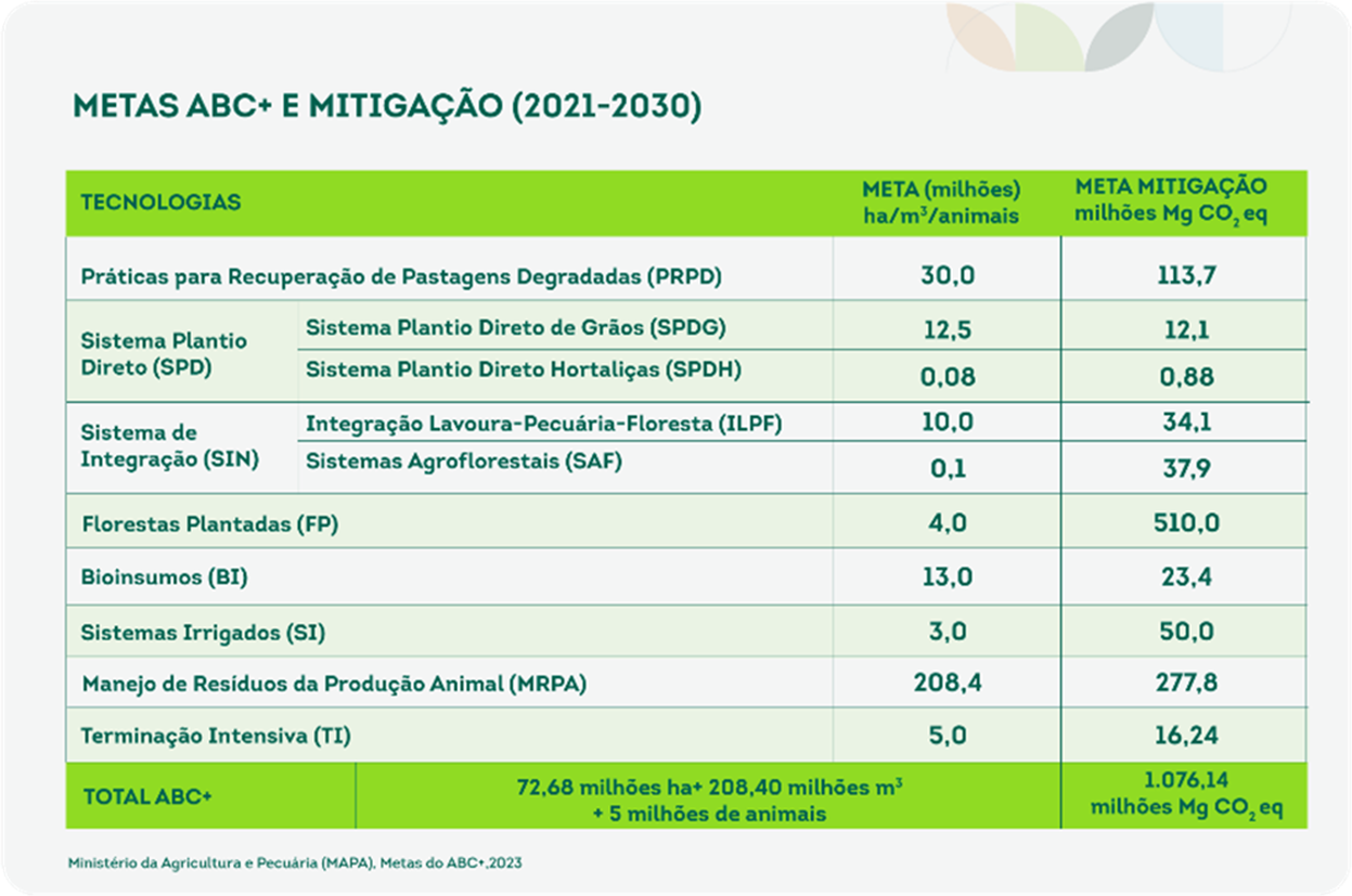 Ministério da Agricultura, Pecuária e Abastecimento, Plano ABC+. Disponível em: https://www.gov.br/agricultura/pt-br/assuntos/sustentabilidade/planoabc-abcmais/abc Acesso em 04 junho 2024.