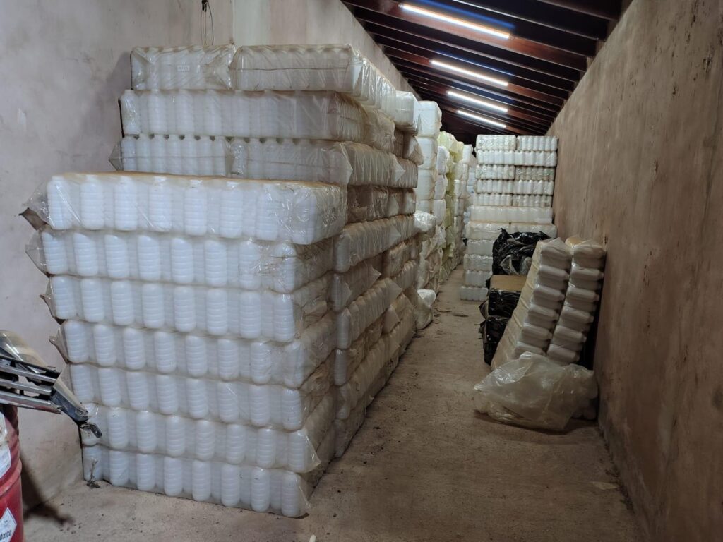 Nos locais vistoriados, foram encontrados equipamentos utilizados na falsificação e mais de 30 mil embalagens irregulares. Ao todo, as garrafas apreendidas poderiam comportar até 155.535 litros de defensivos agrícolas falsificados. Após a operação, os materiais foram encaminhados para perícia da Polícia Científica, que realiza a vistoria dos insumos apreendidos.