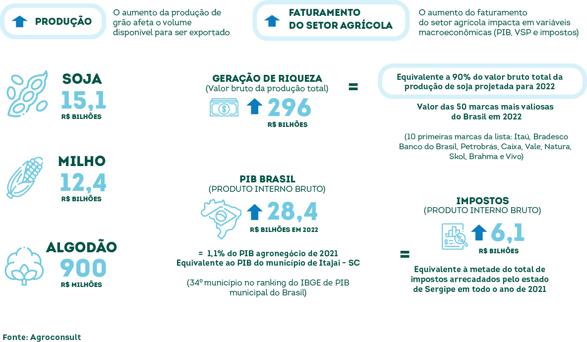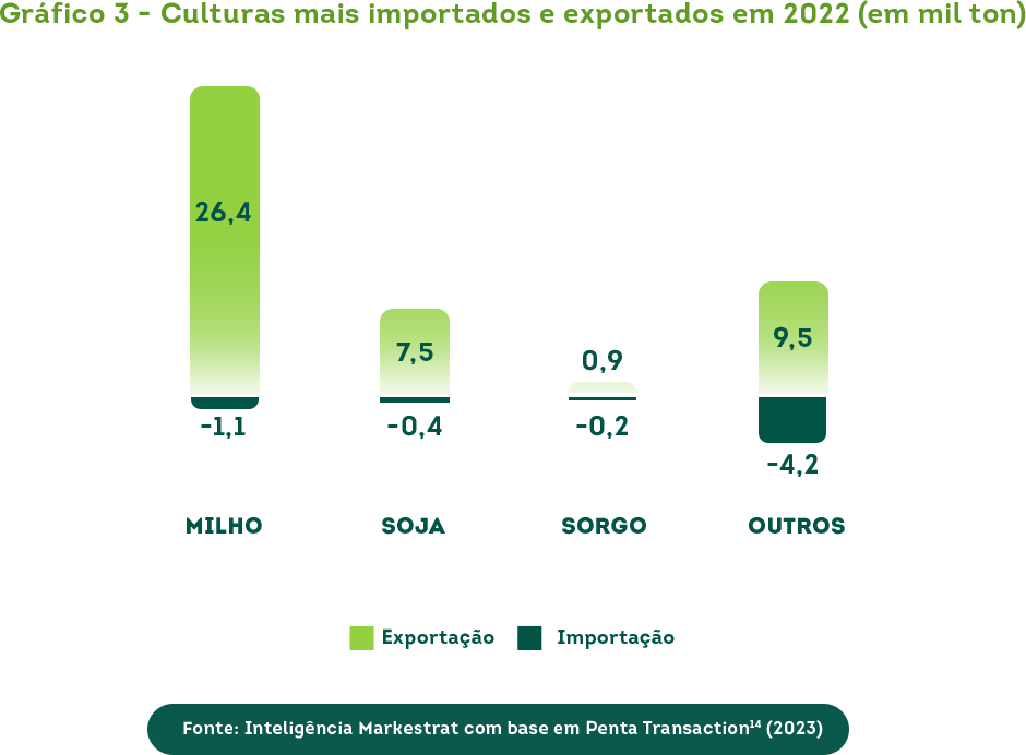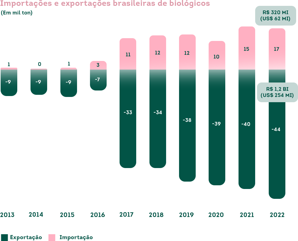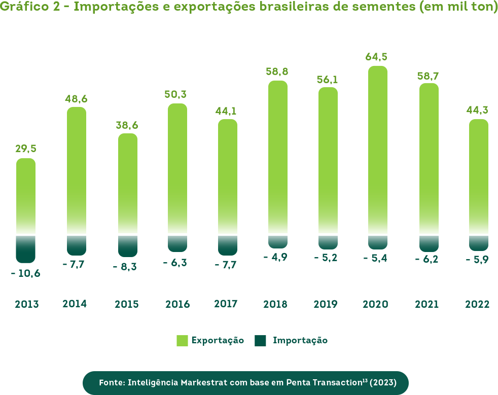 EXPORTAÇÕES E IMPORTAÇÕES No setor de sementes, o Brasil exportou 44 mil toneladas (R$ 1 bilhão) e importou 6 mil toneladas (R$ 100 milhões) em 2022.