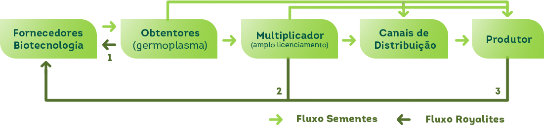 A cadeia envolve fornecedores de biotecnologia, obtentores de sementes e multiplicadores. A figura abaixo demonstra como funciona o desenvolvimento, multiplicação e comercialização de sementes, incluindo o fluxo de cobrança e controle para o pagamento de royalties: