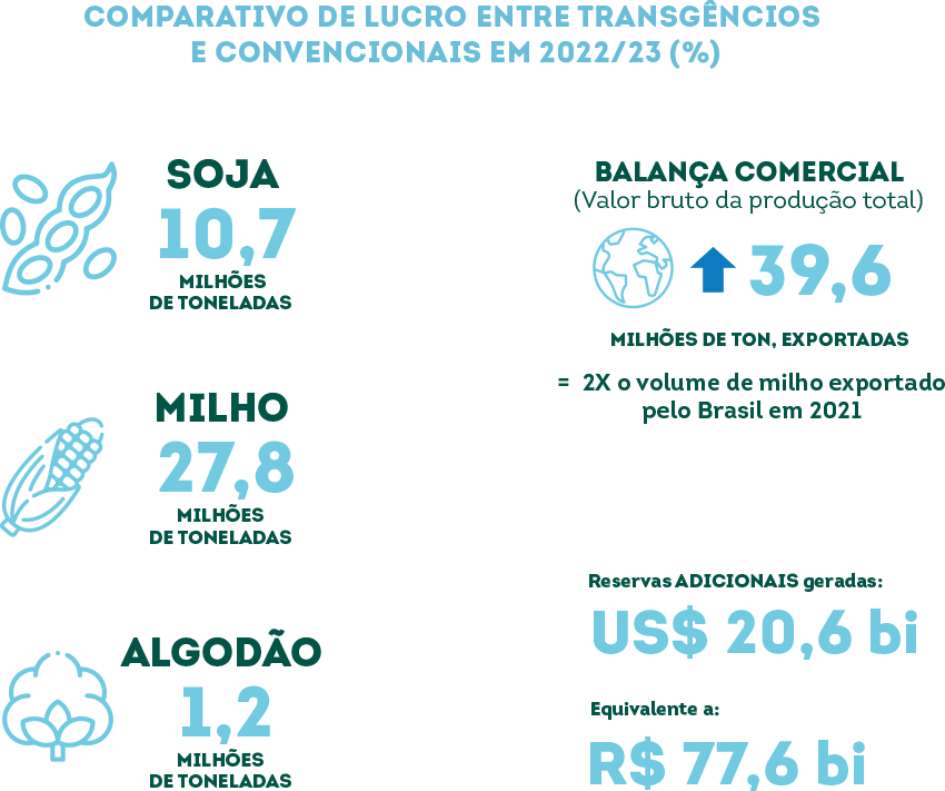Os benefícios proporcionados pela adoção de transgênicos extrapolam os limites da fazenda, impactando em toda atividade econômica. Do ponto de vista do PIB, o ganho decorrente da adoção da biotecnologia nas culturas de soja, milho e algodão representa hoje R$ 28,4 bilhões.