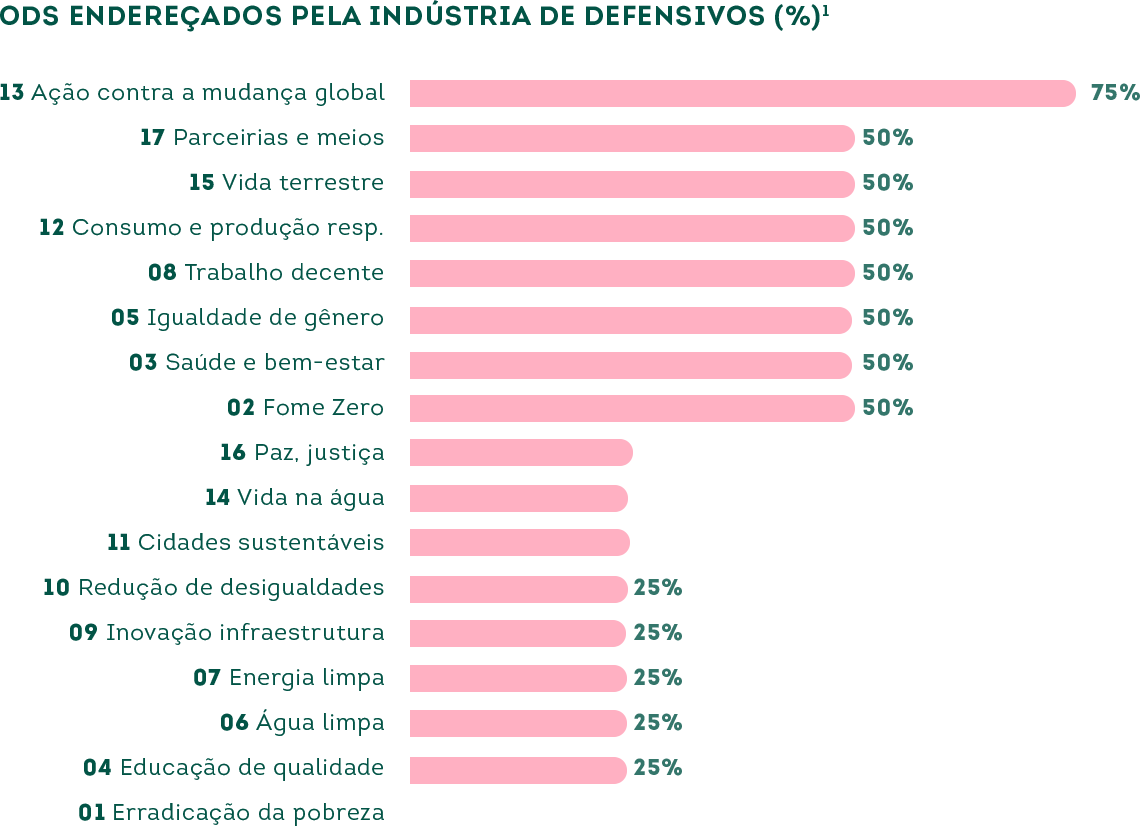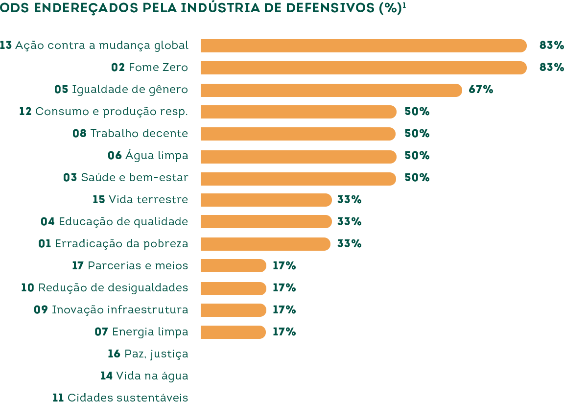 ESG (Environmental, Social, and Governance) Ações contra mudança global, fome zero e igualdade de gênero são as ODS mais endereçadas nas iniciativas de ESG da indústria de defensivos. Mais de 80% do setor possui compromissos públicos relacionados às práticas de ESG sendo que existe uma alta aderência das ações praticadas com a estratégia geral das empresas.