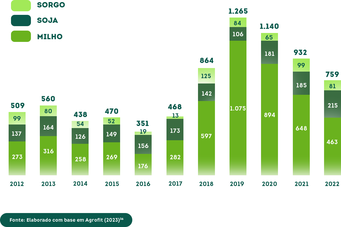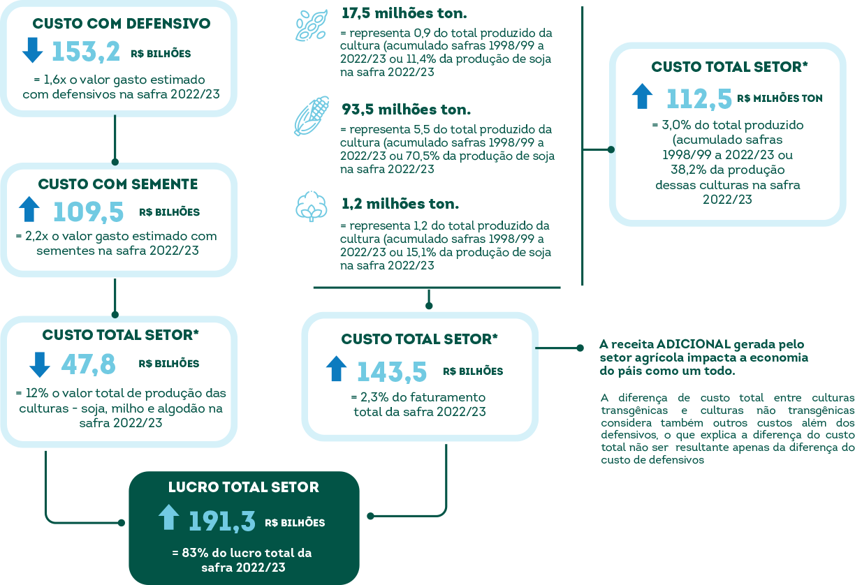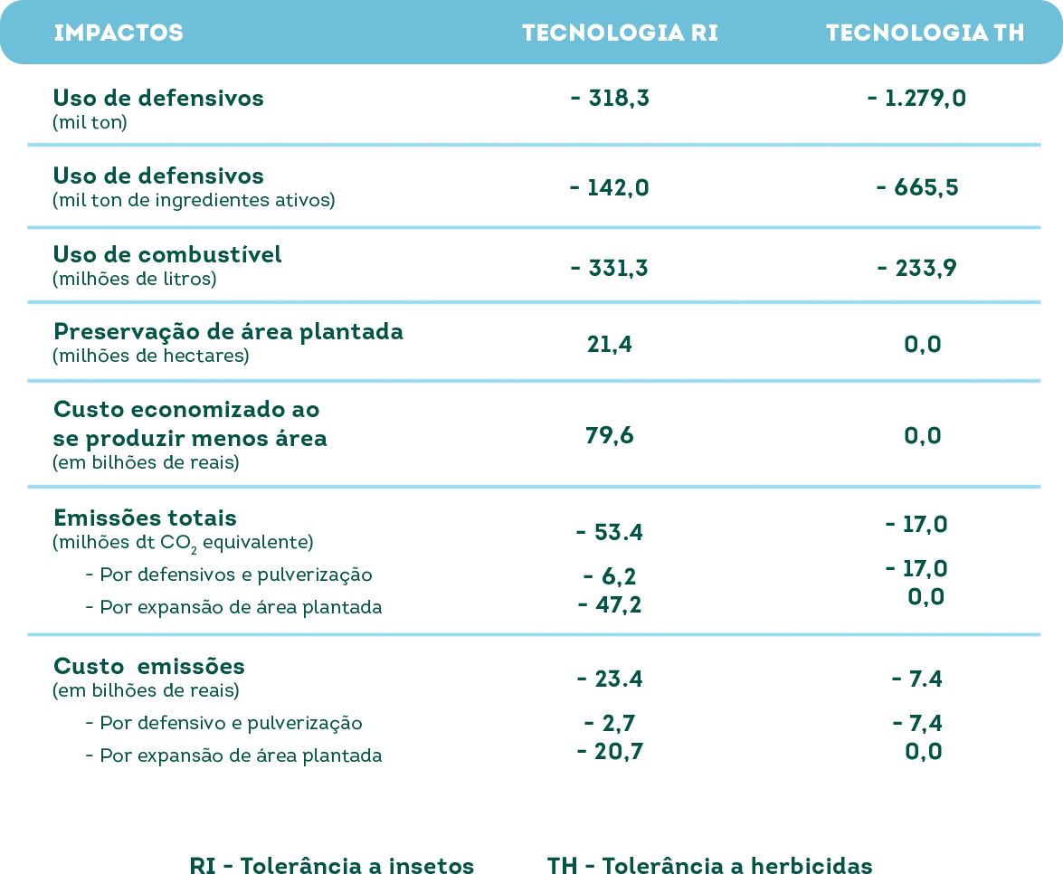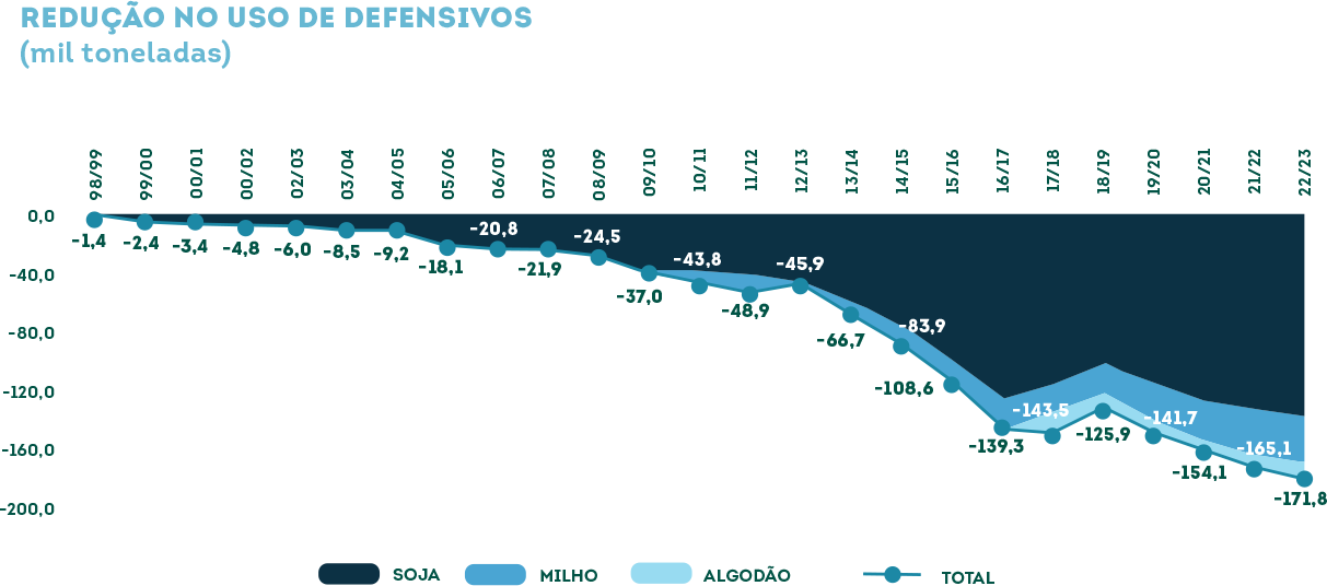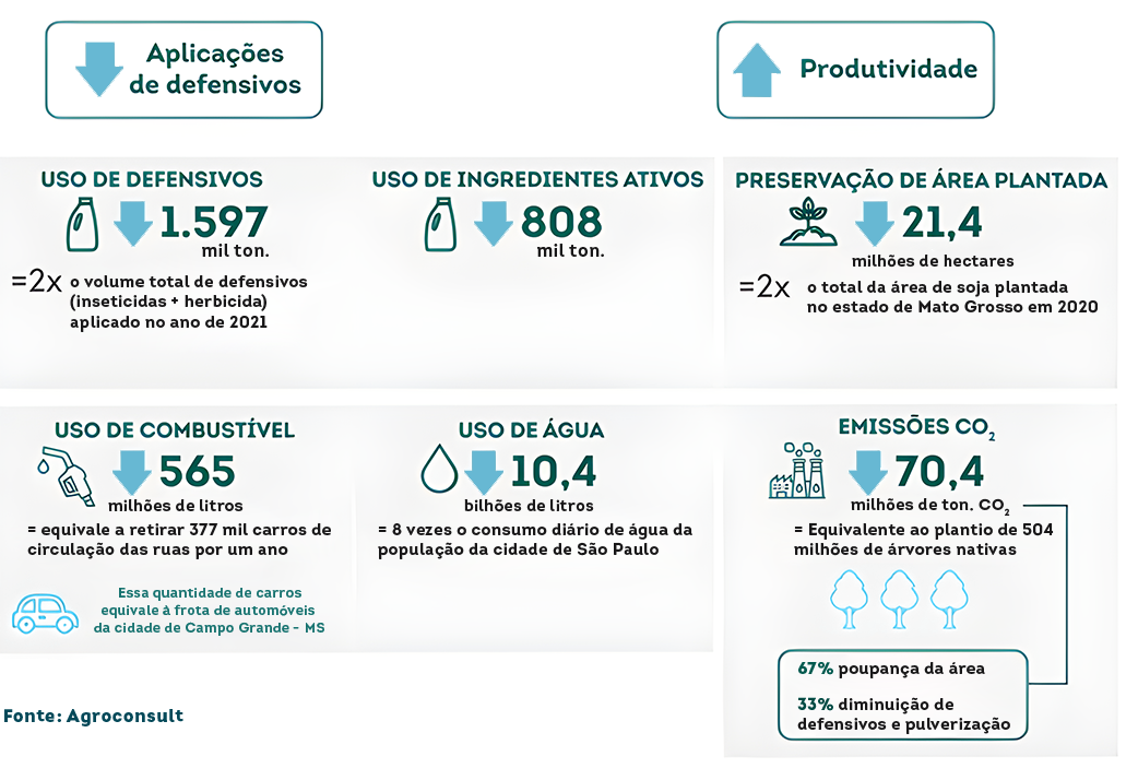 No total, o cultivo de plantas transgênicas contribuiu para redução da utilização de 1.597 mil toneladas de defensivos, o que corresponde à exclusão do ambiente de 808 mil toneladas de princípios ativos distintos usados para o controle de pragas-alvo da tecnologia. Esse montante corresponde ao dobro do volume total de defensivo (inseticida + herbicida) aplicado no ano de 2021 em todo o Brasil.
