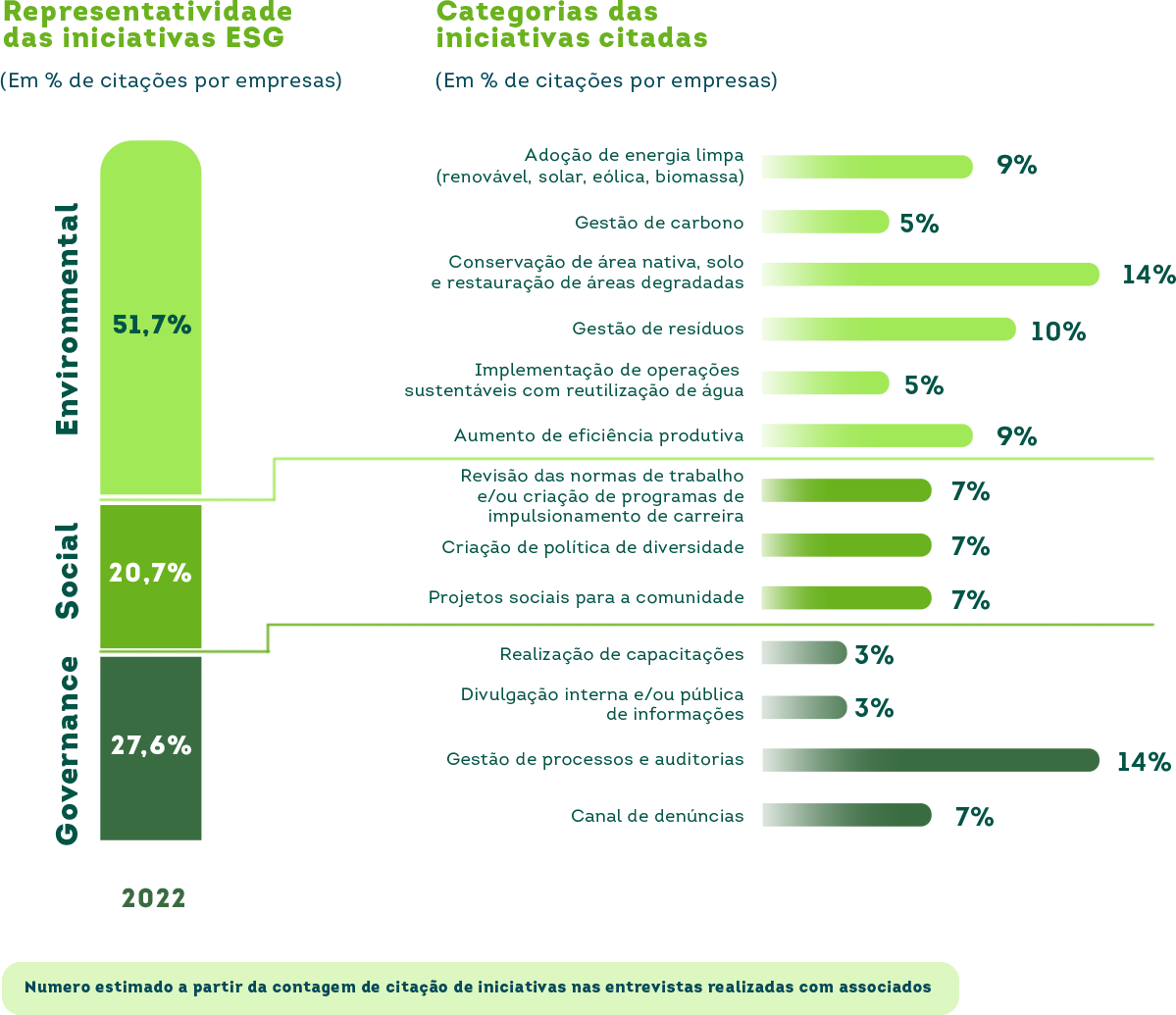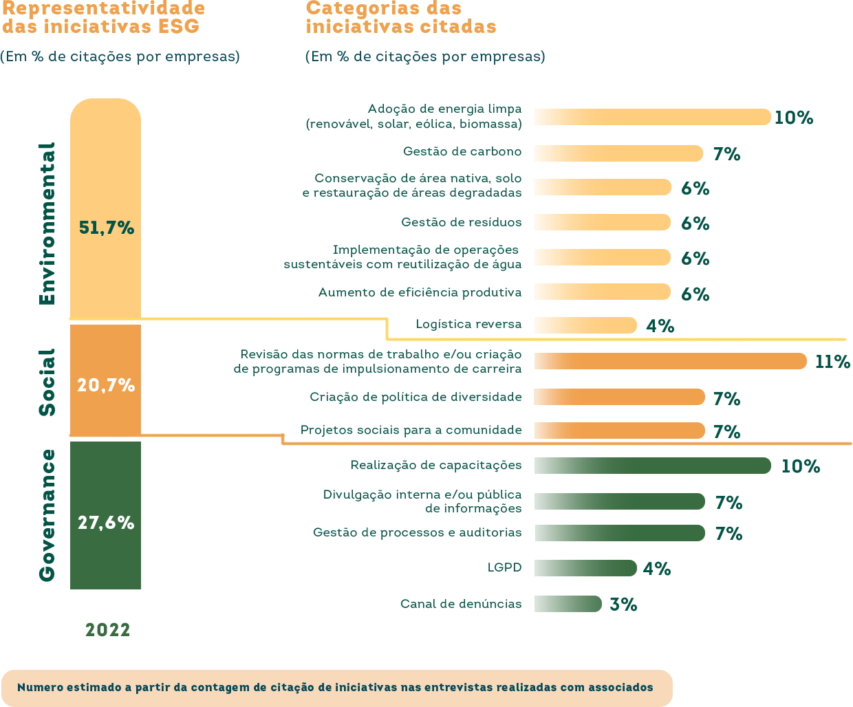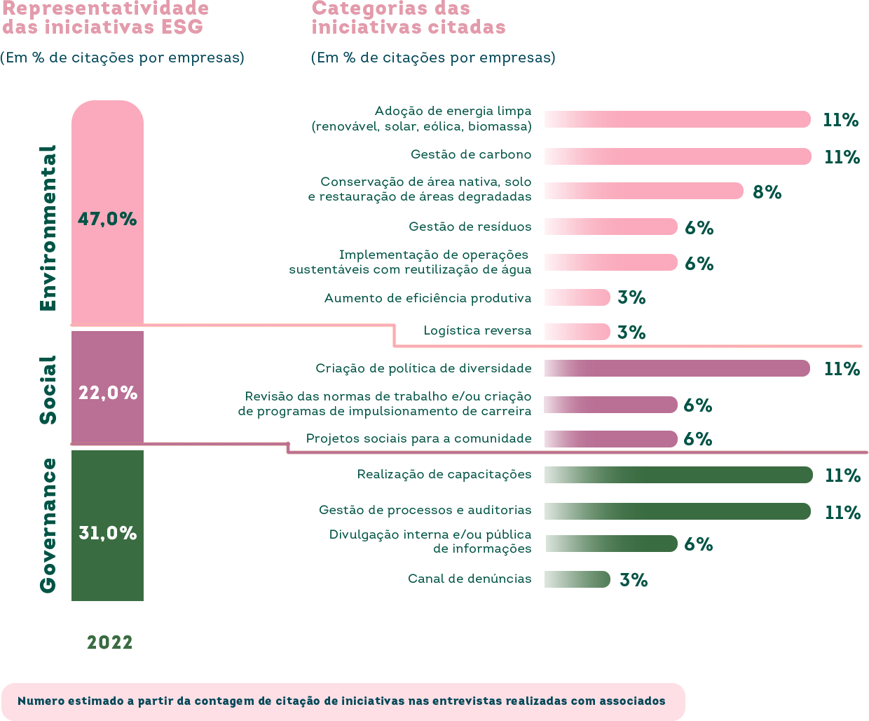 O pilar ambiental concentra a maior parte das iniciativas citadas, sendo que as ações têm grande interação com o produtor. O pilar de governança aparece em segundo lugar com ações mais voltadas para o ambiente institucional da empresa.