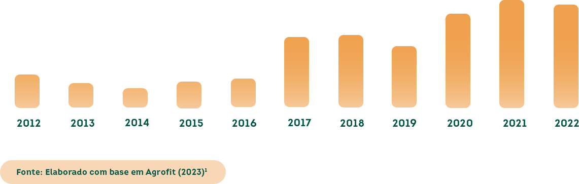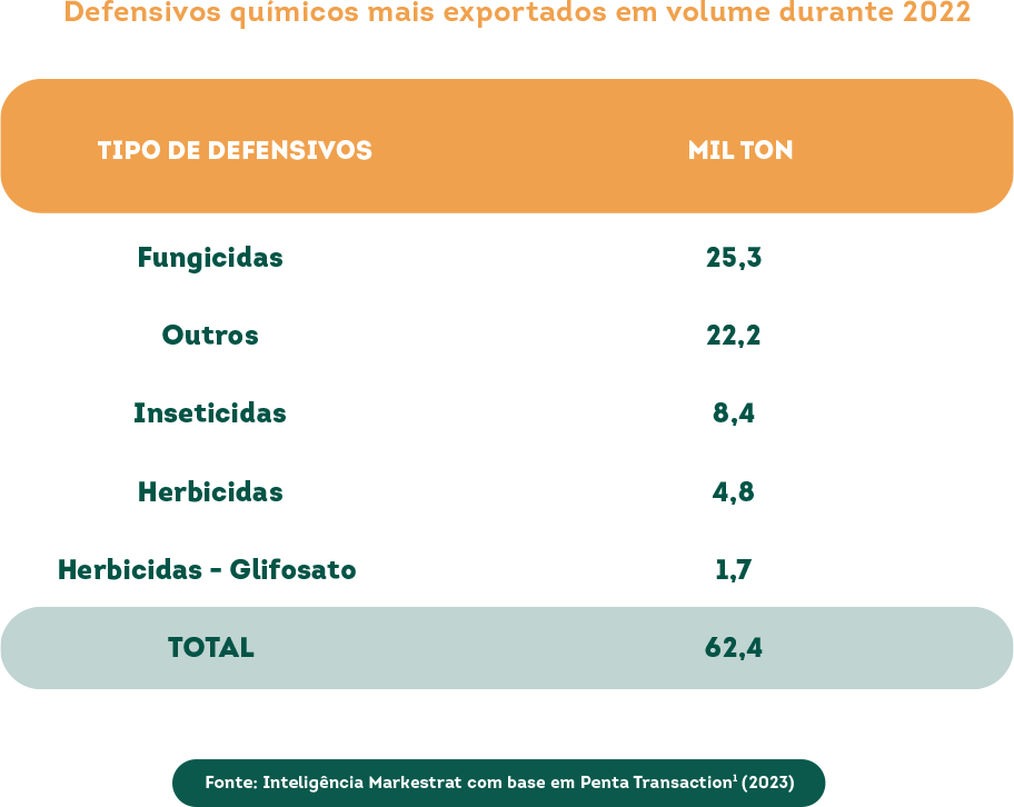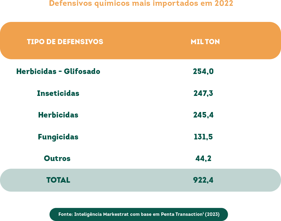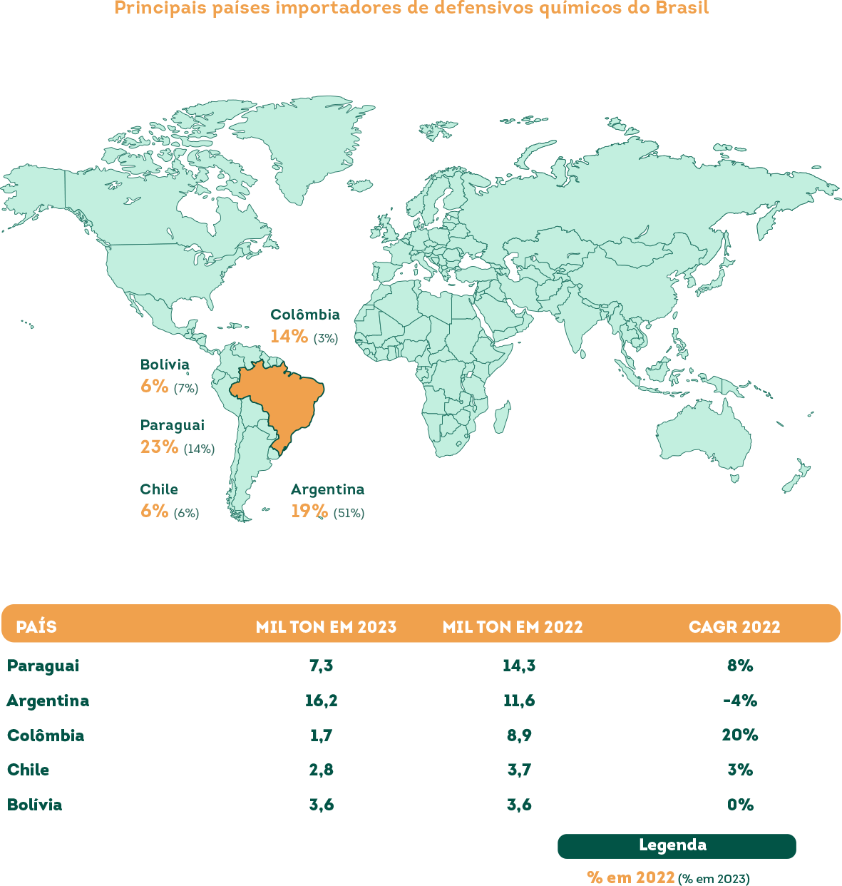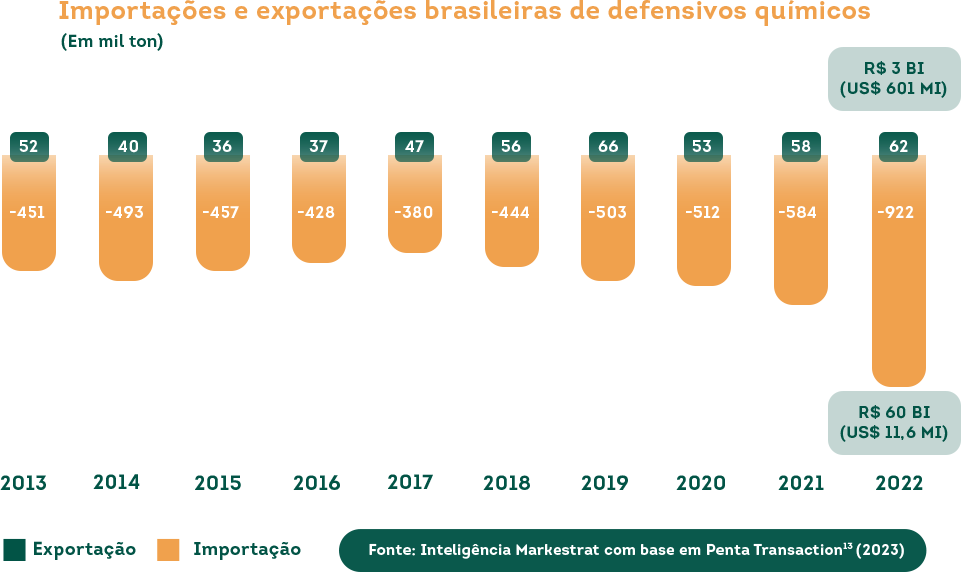 EXPORTAÇÕES E IMPORTAÇÕES O Brasil é um grande formulador de defensivos agrícolas e importou cerca de 922,4 mil toneladas de princípios ativos em 2022 para atender à demanda interna, o que representou R$ 60 bilhões (US$11,6 bilhões).