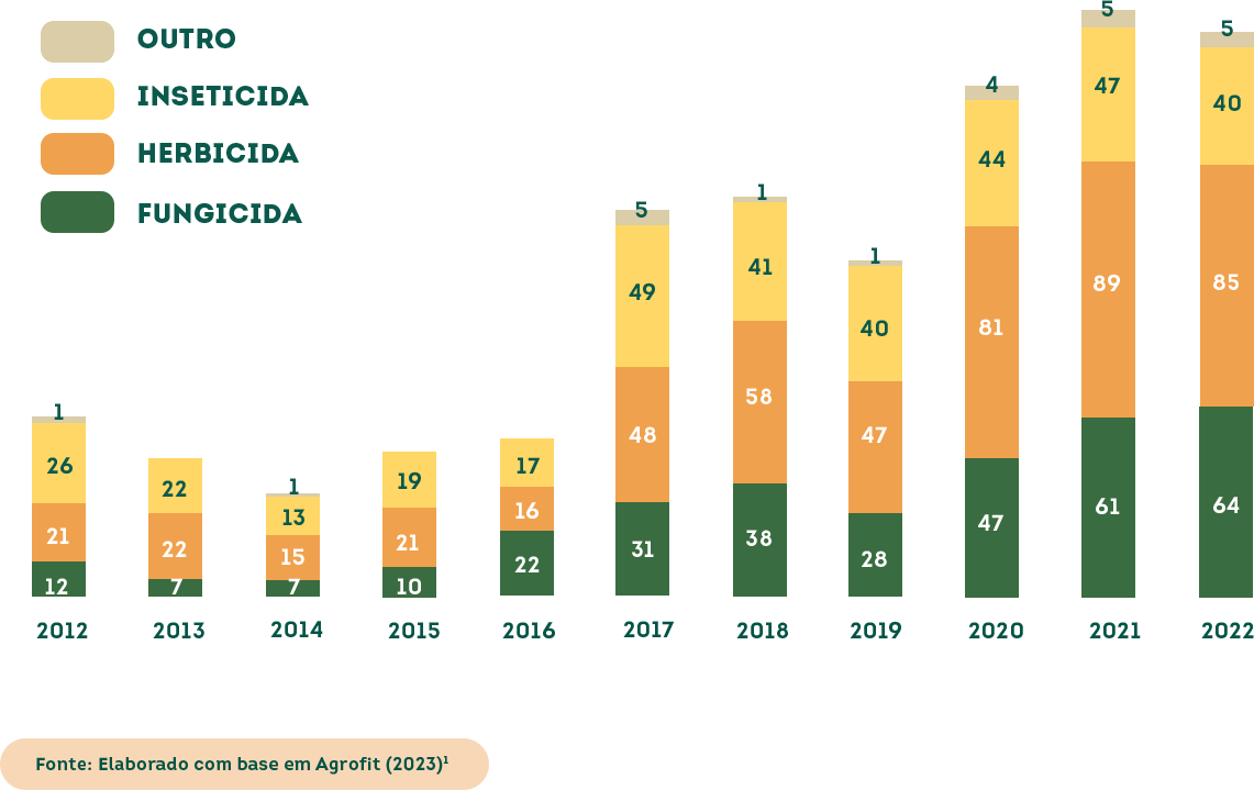 O processo de registro classifica os produtos em quatro segmentos principais: herbicidas, inseticidas, fungicidas e outros. Historicamente, a categoria de herbicidas é a que apresenta o maior número de registros. Evolução do número de registros no Brasil considerando os principais segmentos.