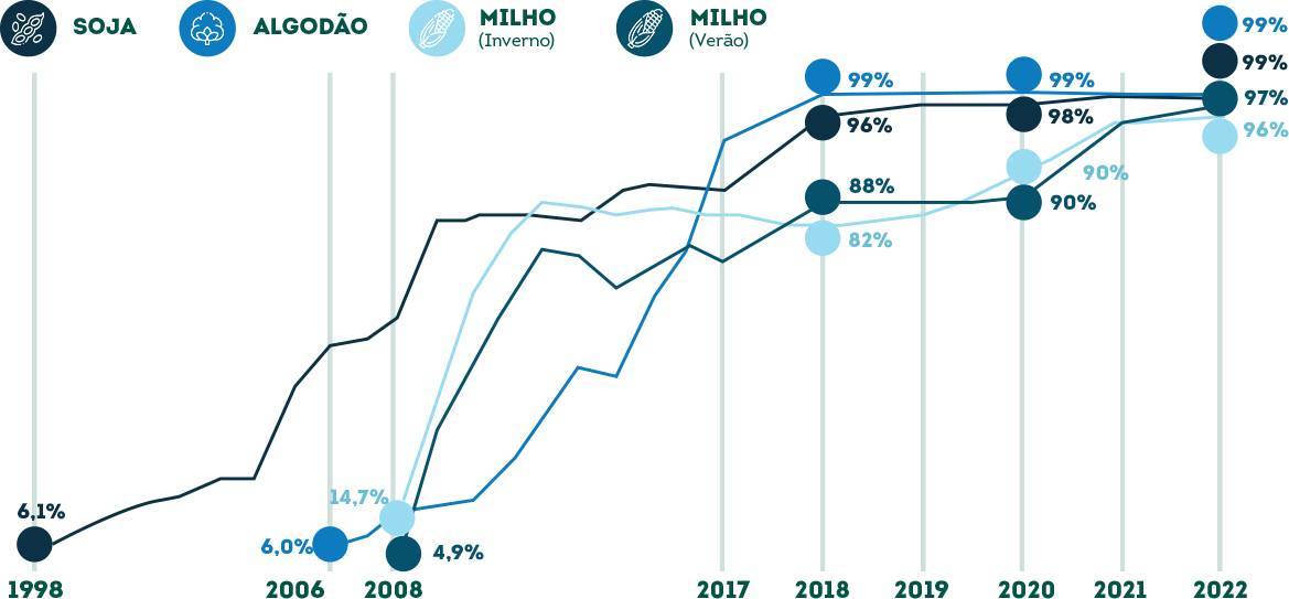 Os benefícios das tecnologias incluídas nas sementes aprimoradas pela biotecnologia ficam evidentes pelas elevadas taxas de adoção no campo: