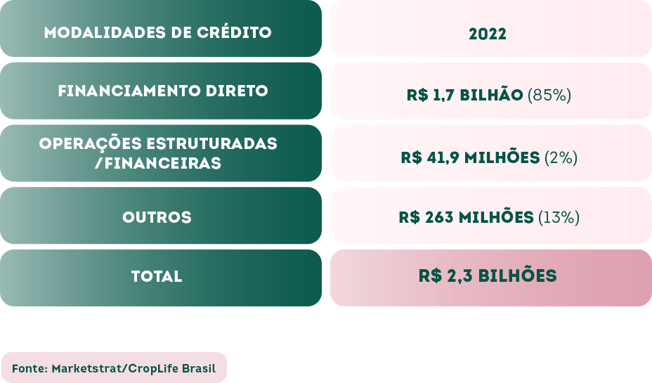 CRÉDITO Cerca de 87% das vendas da indústria de bioinsumos em 2022 foram realizadas por meio de operações de crédito, o que representa um somatório de R$ 2,3 bilhões, abrangendo as diversas modalidades disponíveis.