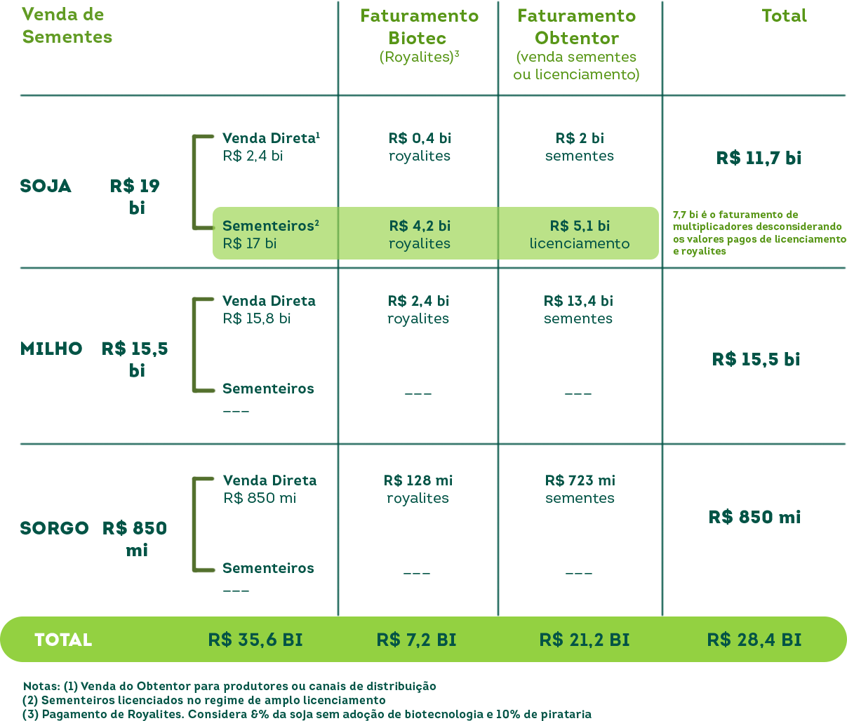 FATURAMENTO O faturamento, em 2022, com a venda de sementes de soja, milho e sorgo, incluindo o faturamento dos multiplicadores, foi de cerca de R$36 bilhões, divididos em 53% para obtentores e 47% para sementeiros.