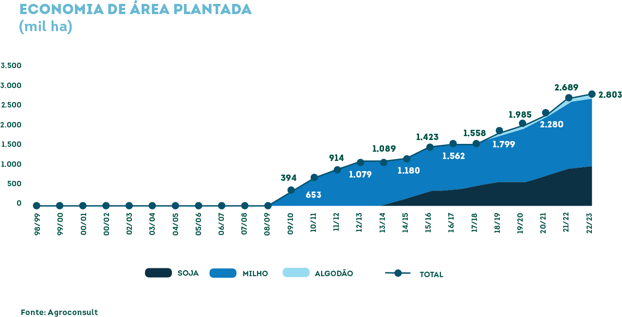 Em relação às safras de 2018/19 até 2022/23, foi observada uma expressiva economia de água.