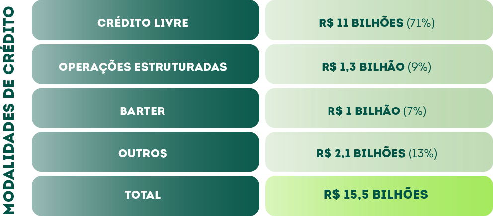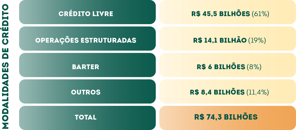 – As principais modalidades de crédito incluem crédito livre (71%), operações estruturadas (9%) e barter (7%).