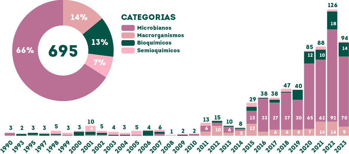 O Brasil utiliza produtos biológicos há anos no controle de pragas que afetam as lavouras, com registros desde 1960 para combater a cigarrinha da cana-de-açúcar e a lagarta da soja. Os bioinsumos, também chamados de biopesticidas, biodefensivos ou controle biológico, são organismos vivos ou substâncias naturais capazes de prevenir, controlar ou erradicar pragas, oferecendo maior segurança ambiental devido à sua seletividade e rápida decomposição. Esses produtos são eficazes em pequenas quantidades, podem ser usados junto com defensivos químicos no Manejo Integrado de Pragas (MIP), e algumas formulações são adequadas para a agricultura orgânica.