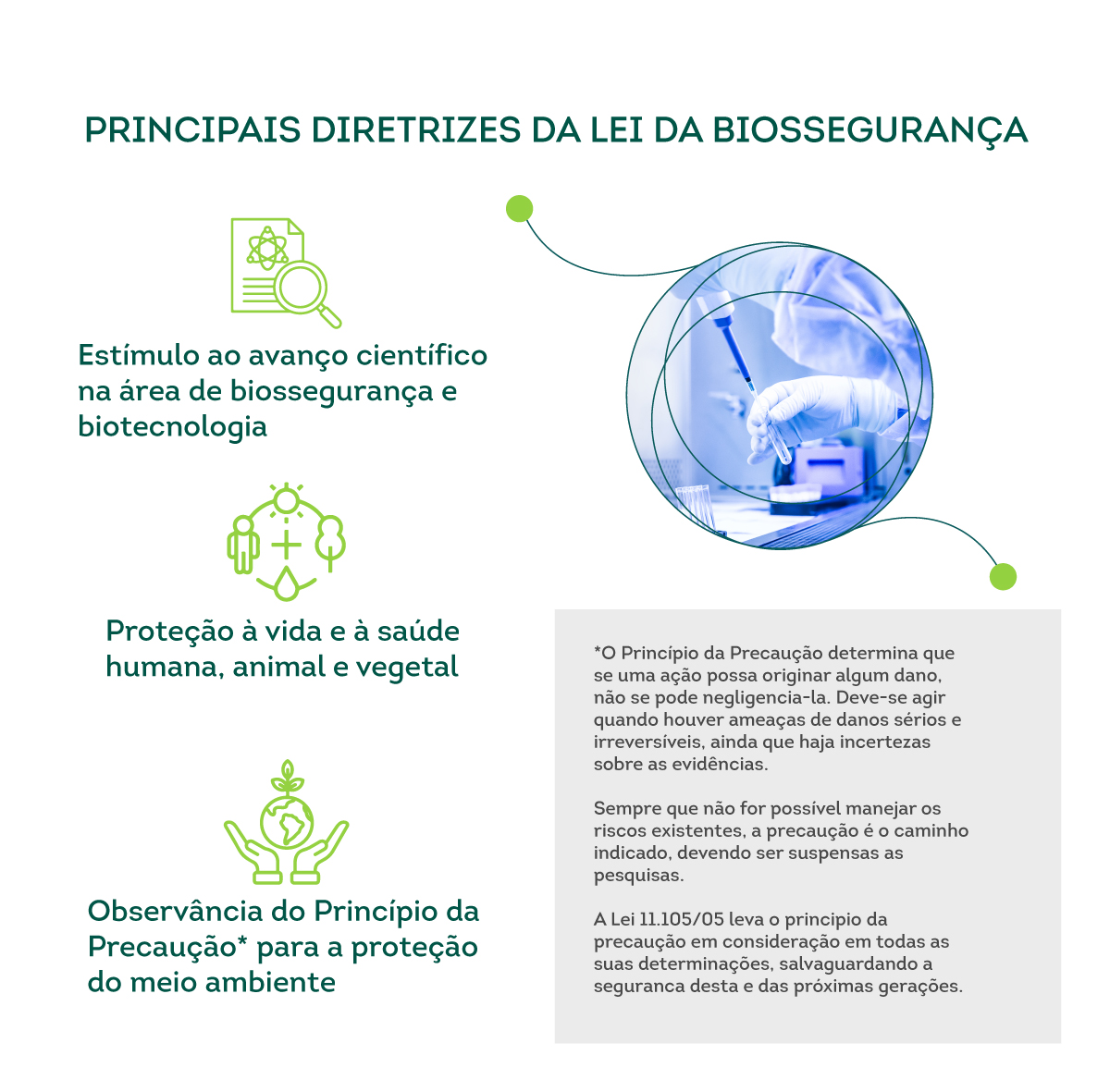 Existem três diretrizes principais estabelecidas pela Lei da Biossegurança. Essas diretrizes incluem o estímulo ao avanço científico, proteção à vida e a saúde, assim como o atendimento ao Princípio da Precaução. Desta forma, o desenvolvimento e uso de produtos de biotecnologia precisam garantir que são seguros (biossegurança) ao meio ambiente, aos animais e aos seres humanos.