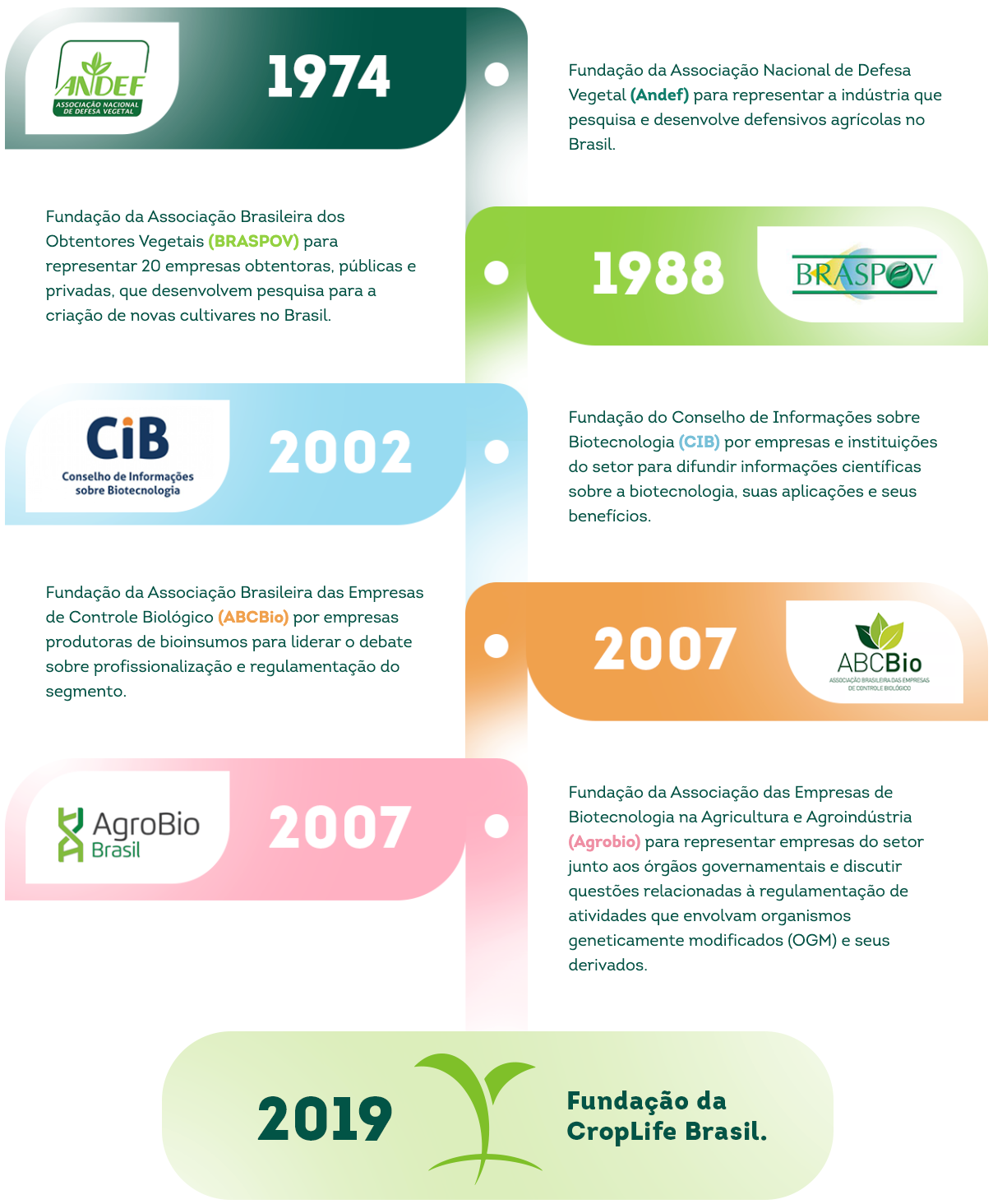 A CropLife Brasil é resultado da fusão da Associação Nacional de Defesa Vegetal (Andef), do Conselho de Informações sobre Biotecnologia (CIB), da Associação Brasileira das Empresas de Controle Biológico (ABCBio) e da Associação das Empresas de Biotecnologia na Agricultura e Agroindústria (AgroBio).