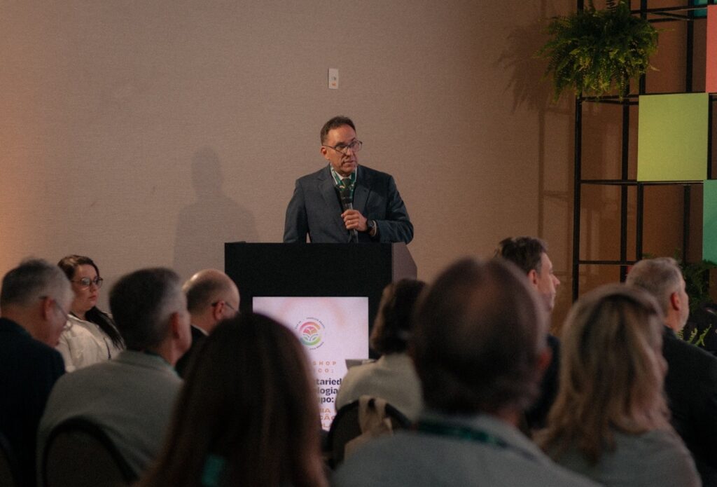 Para iniciar e fomentar as discussões, o workshop trouxe uma contextualização sobre a adoção de tecnologias nos sistemas produtivos integradas às práticas de manejo, que permitam produzir e evitar impactos dos eventos climáticos extremos, com foco na redução de emissões de gases de efeito estufa (GEEs). A condução ficou por parte do Sócio-diretor da Agroicone, Rodrigo Lima, especialista no tema. “A COP30 será um momento estratégico para plantar essa semente dentro dessa agenda multilateral. Não existe solução única. É preciso combinar inúmeras tecnologias e práticas de manejo, dentro da realidade de cada país. Isso é uma evolução constante”, complementou.