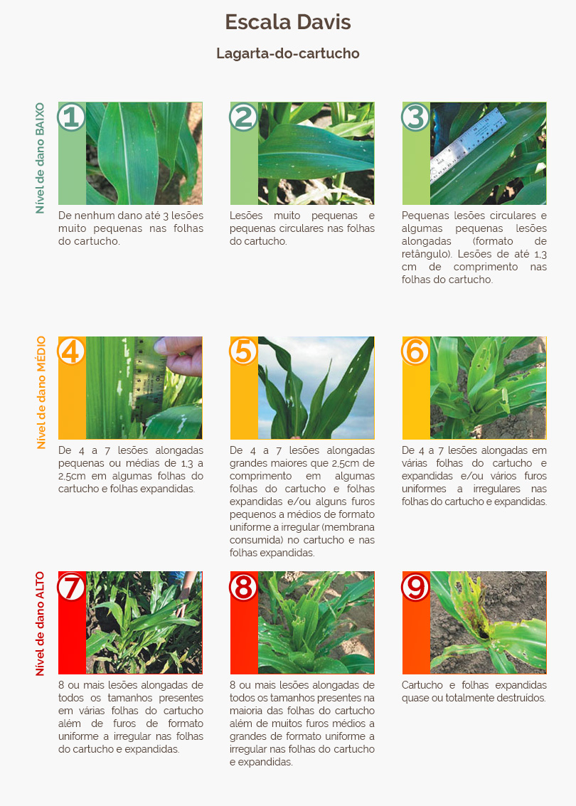 No caso da lagarta-do-cartucho (Spodoptera frugiperda), tanto em lavouras com variedades Bt como em lavouras de variedades convencionais, recomenda-se o controle com inseticidas quando 17% das plantas atingirem nível 3 na escala Davis. Ou seja, lesões circulares ou indefinidas no cartucho, de 1,3 cm de comprimento nas folhas novas ou já expandidas.