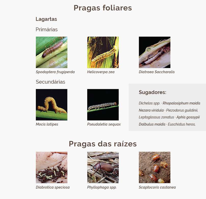 Em regiões onde historicamente há maior pressão do inseto Spodoptera frugiperda e sob condições ambientais que favorecem a ocorrência de um rápido e melhor desenvolvimento do inseto, recomenda-se antecipar o controle com inseticida utilizando-se como parâmetro o nível de 10% de plantas atacadas.