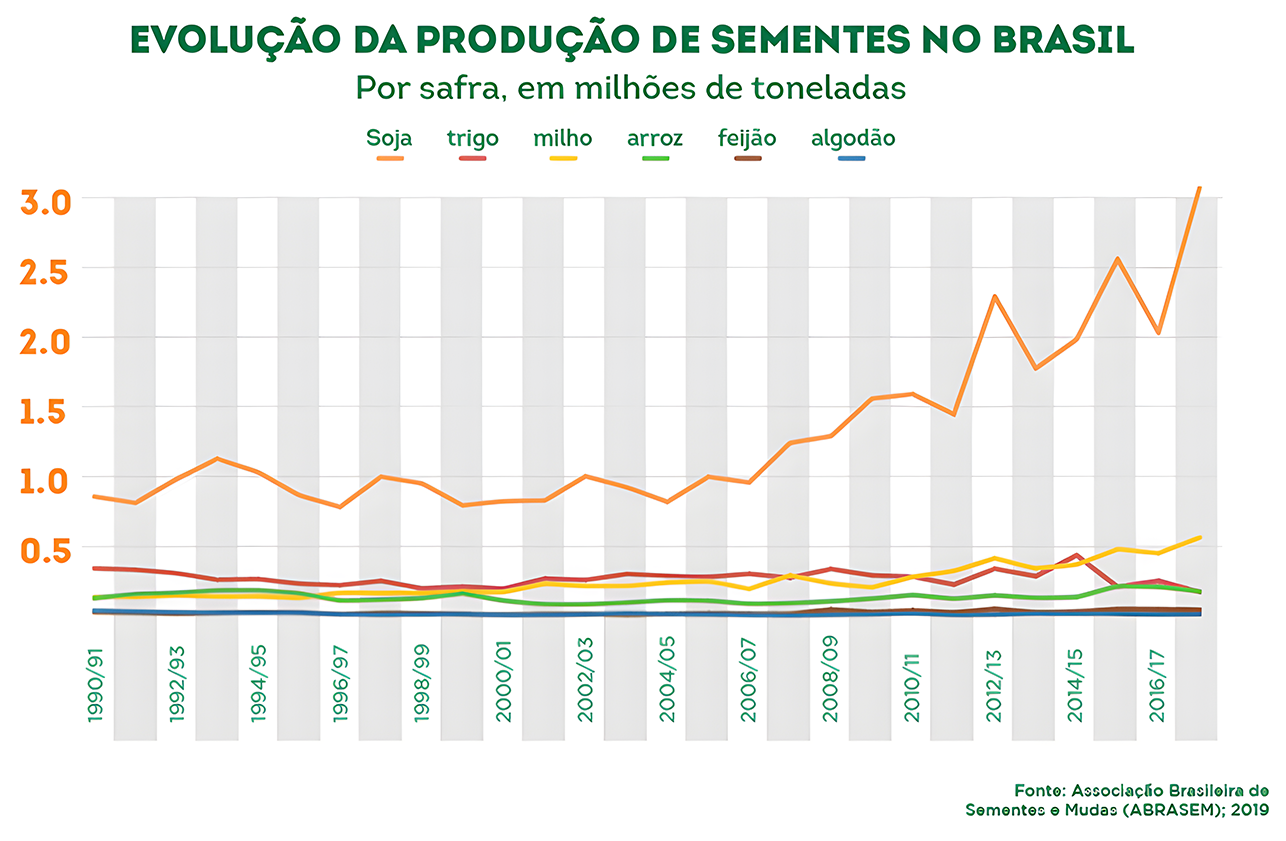 Atualmente, o Brasil é referência no desenvolvimento de plantas adaptadas às condições tropicais e subtropicais. Em 10 anos, a safra brasileira de sementes saltou de 1,7 milhão de toneladas, na safra de 2005/06, para 4 milhões de toneladas de sementes, na safra 2016/17.