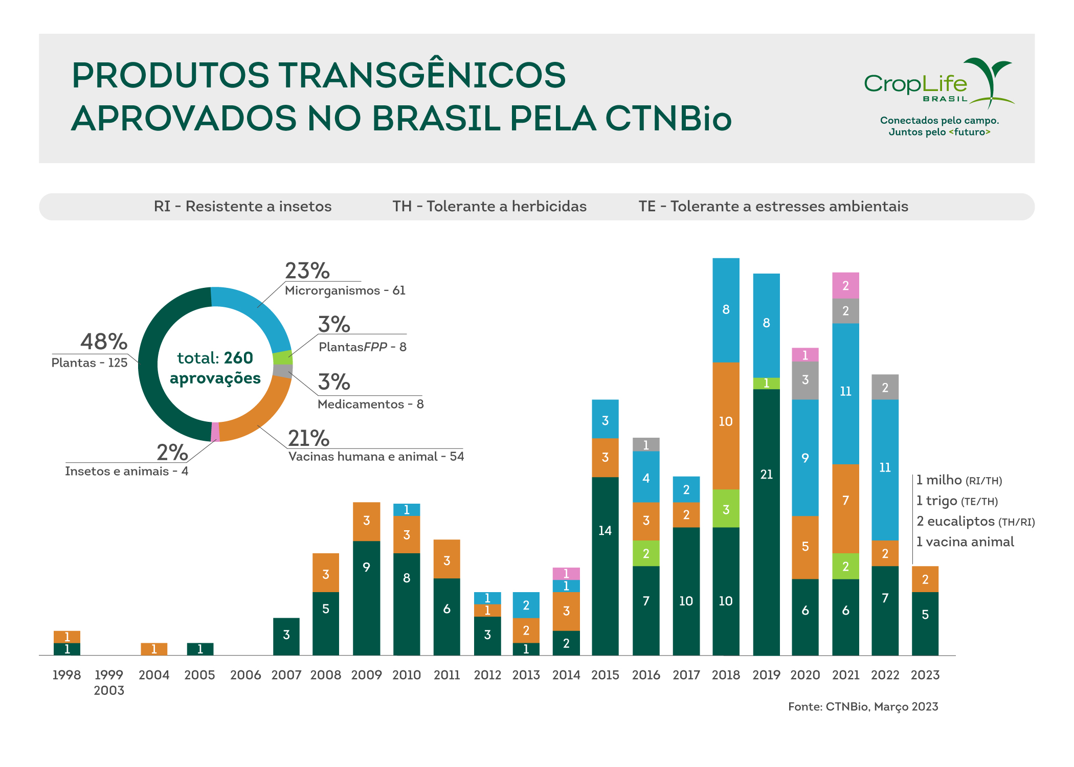 Essa lei também é responsável por criar o Conselho Nacional de Biossegurança (CNBS) e estabelecer claramente os papéis da Comissão Técnica Nacional de Biossegurança (CTNBio). Compete à CTNBio, por exemplo, definir normas para as pesquisas com OGM e seus derivados. Assim como, a Comissão também é responsável pela análise da avaliação de risco do OGM no vegetal, meio ambiente e saúde animal e humana. O Brasil já aprovou 260 organismos geneticamente modificados. Compondo esse grupo de produtos encontramos plantas, vacinas, medicamentos, microrganismos e insetos.