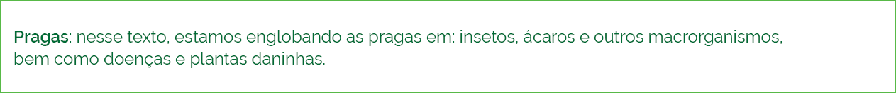 Segundo a FAO (Organização das Nações Unidas para Alimentação e Agricultura), cerca de 40% da produção agrícola do mundo pode ser perdida todos os anos pelo ataque de pragas. No Brasil, o clima promove que a diversidade e a população das pragas sejam bem maiores do que em países de clima frio, com o inverno intenso.