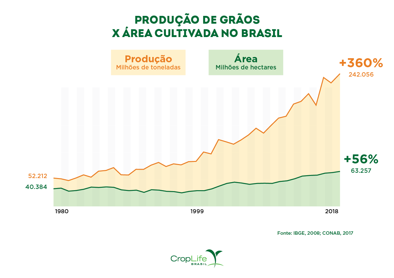 Nas últimas três décadas o Brasil teve crescimento de 360% na produção agrícola de grãos, enquanto o uso de suas terras para esse fim cresceu em apenas 56%. Em 1980 eram produzidas 52,21 milhões de toneladas em 40,38 milhões de hectares, em 2018 a safra atingiu 242,12 milhões de toneladas em apenas 63,22 milhões de hectares. O último levantamento da CONAB aponta que a safra 2019/20 – deve chegar 250,9 milhões de toneladas.