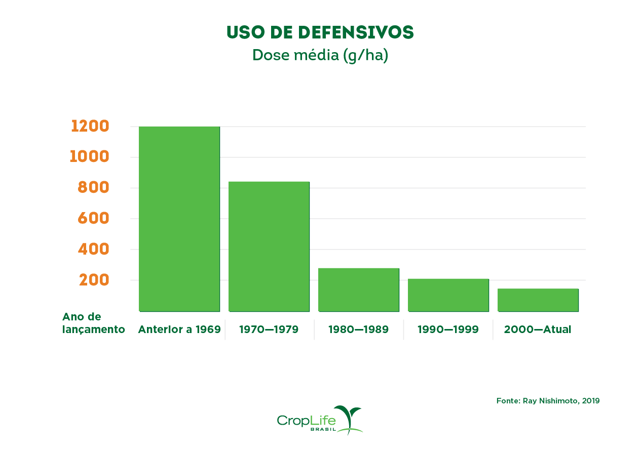 Ainda que diversos produtos com características inovadoras ainda estejam em avaliação aqui no Brasil, já observamos mudanças no padrão de uso de defensivos.  Analisando os defensivos em uso no Brasil, é evidente que houve uma redução muito significativa das doses médias utilizadas. Podemos dizer que a dose média dos produtos lançados a partir do ano 2000 corresponde a 12% da dose média dos produtos anteriores a década de 70. Esse resultado é um forte indicador de maior eficiência e de menor risco, por reduzir a exposição.